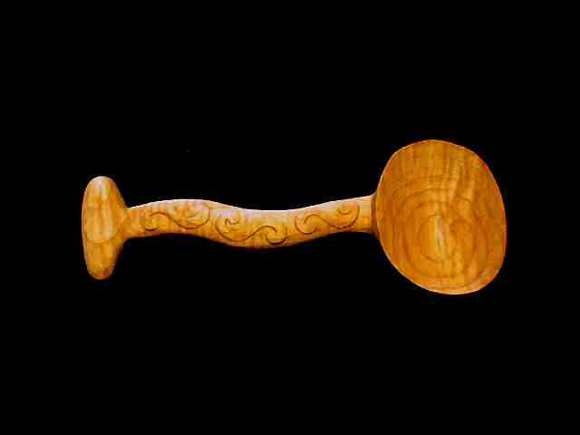 All the spoons are hand carved and sanded and one of a kind. They are finished with a light cooking oil and are definitely usable. Some are made from kiln dried blanks of wood, usually maple or cherry wood while others are made from branches and wood split from raw logs. For the most part I use native hardwoods. Cherry Maple, Walnut, Osage Orange, Locust, Oak, Mulberry, Pear, Elm, Apple, Yew and other woods. Each has its distinct characteristics. Personally I view the spoons as abstract works of art with the spoon shape the foundation of the piece. Design wise I do push the functionality of the work to the extreme sometimes. I must say that I have fun all the time while I'm making spoons!